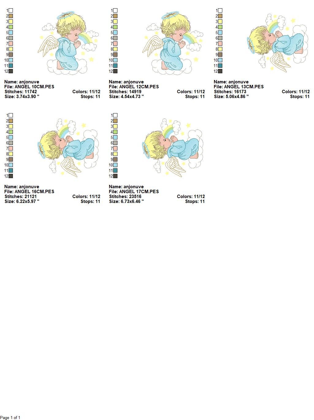 There are 5 sizes included, please check the information under the pictures for the precise sizes of each design, stitch count, color changes and etc.