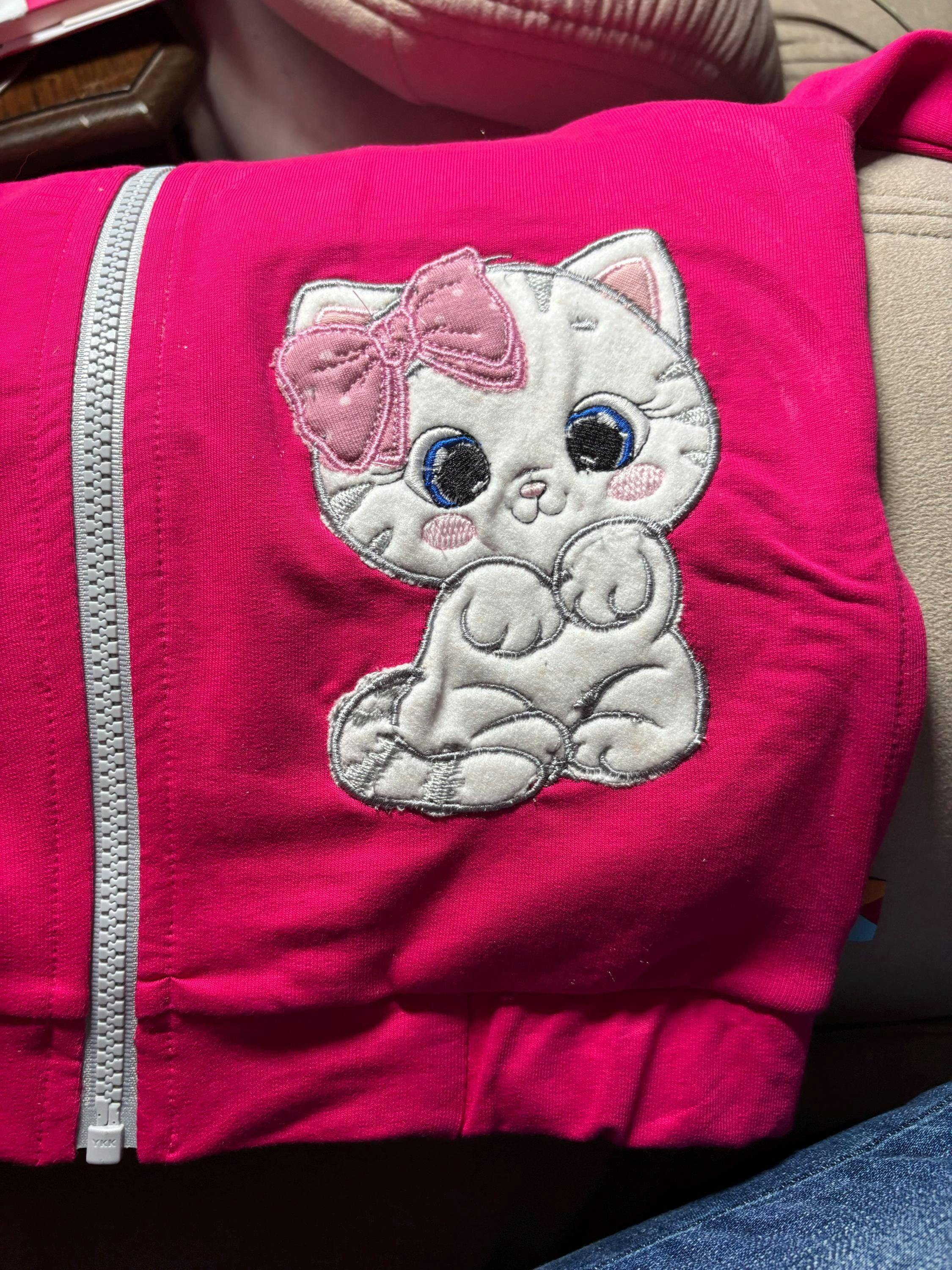 Felicity Wzór super dopracowany, śliczny. Ja niestety mam mało profesjonalną hafciarka , tamborek 10x10, musiałam podzielić wzór, więc było trudniej. I do tego odpiął mi się tamborek przy przedostatniej nitce😚. Kotek wyszedł trochę krzywy ale i tak bardzo mi się podoba. Bardzo dziękuję.❤️