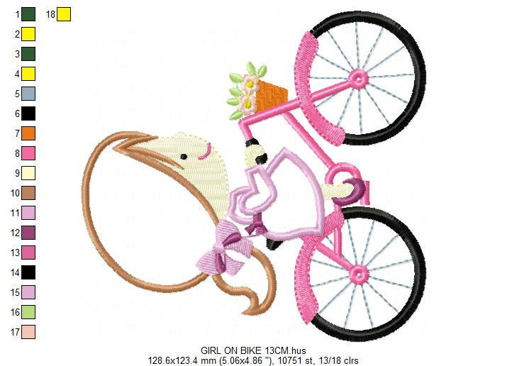 This is a digital download machine embroidery design of GIRL WITH BIKE, applique design, instant download.