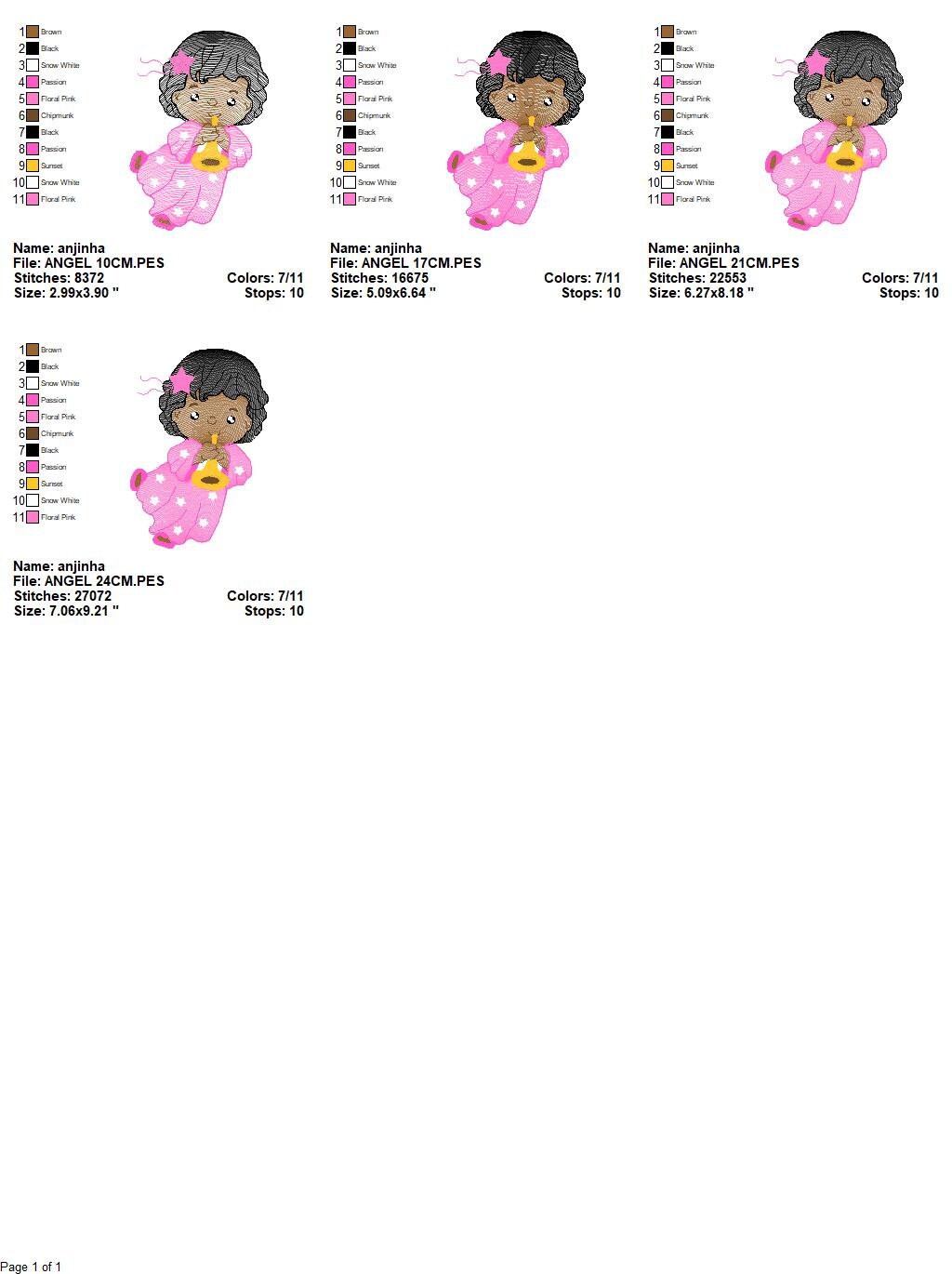 There are 4 sizes included, please check the information under the pictures for the precise sizes of each design, stitch count, color changes and etc.