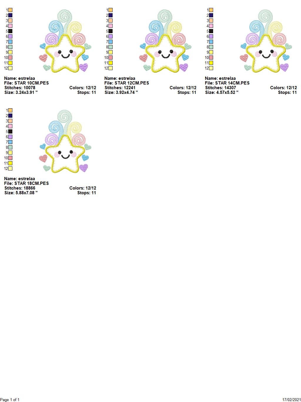 There are 4 sizes included, please check the information under the pictures for the precise sizes of each design, stitch count, color changes and etc.