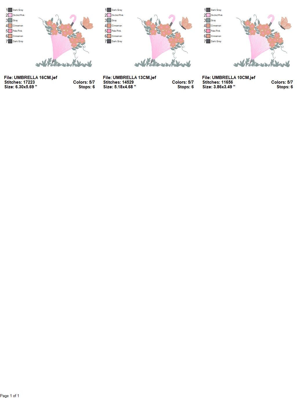 There are 3 sizes included, please check the information under the pictures for the precise sizes of each design, stitch count, color changes etc.