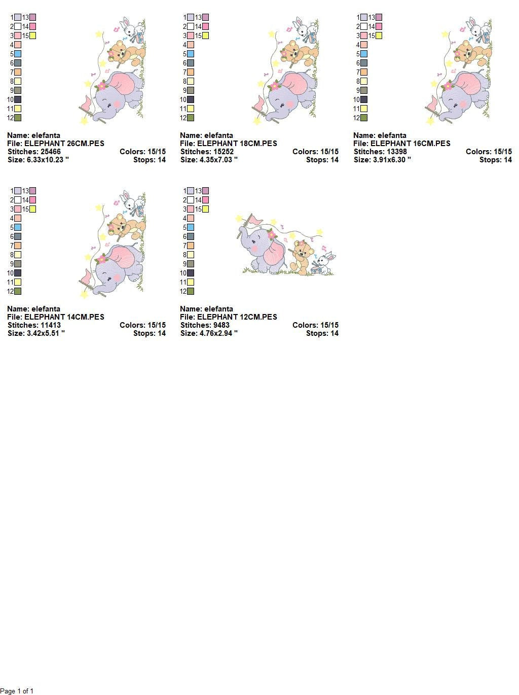 There are 5 sizes included for each design, please check the information under the pictures for the precise sizes of each design, stitch count, color changes and etc.