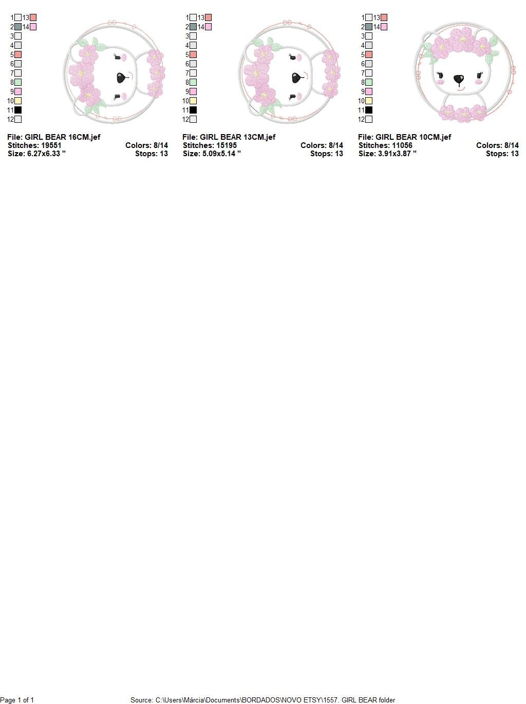 There are 3 sizes included, please check the information under the pictures for the precise sizes of each design, stitch count, color changes and etc.
