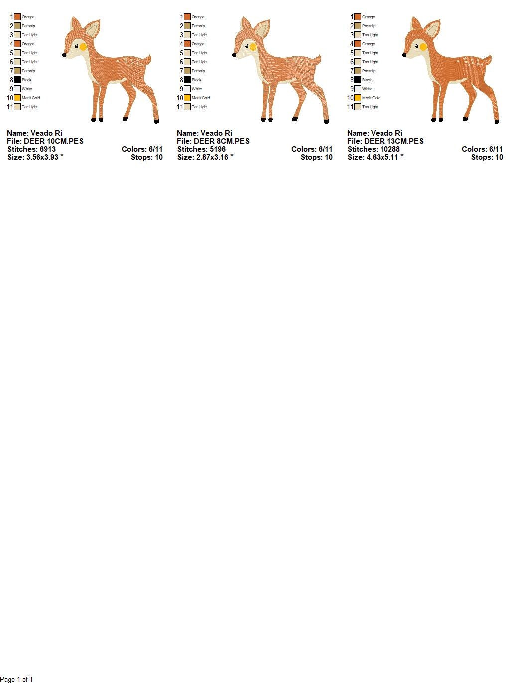 There are 3 sizes included, please check the information under the pictures for the precise sizes of each design, stitch count, color changes and etc.