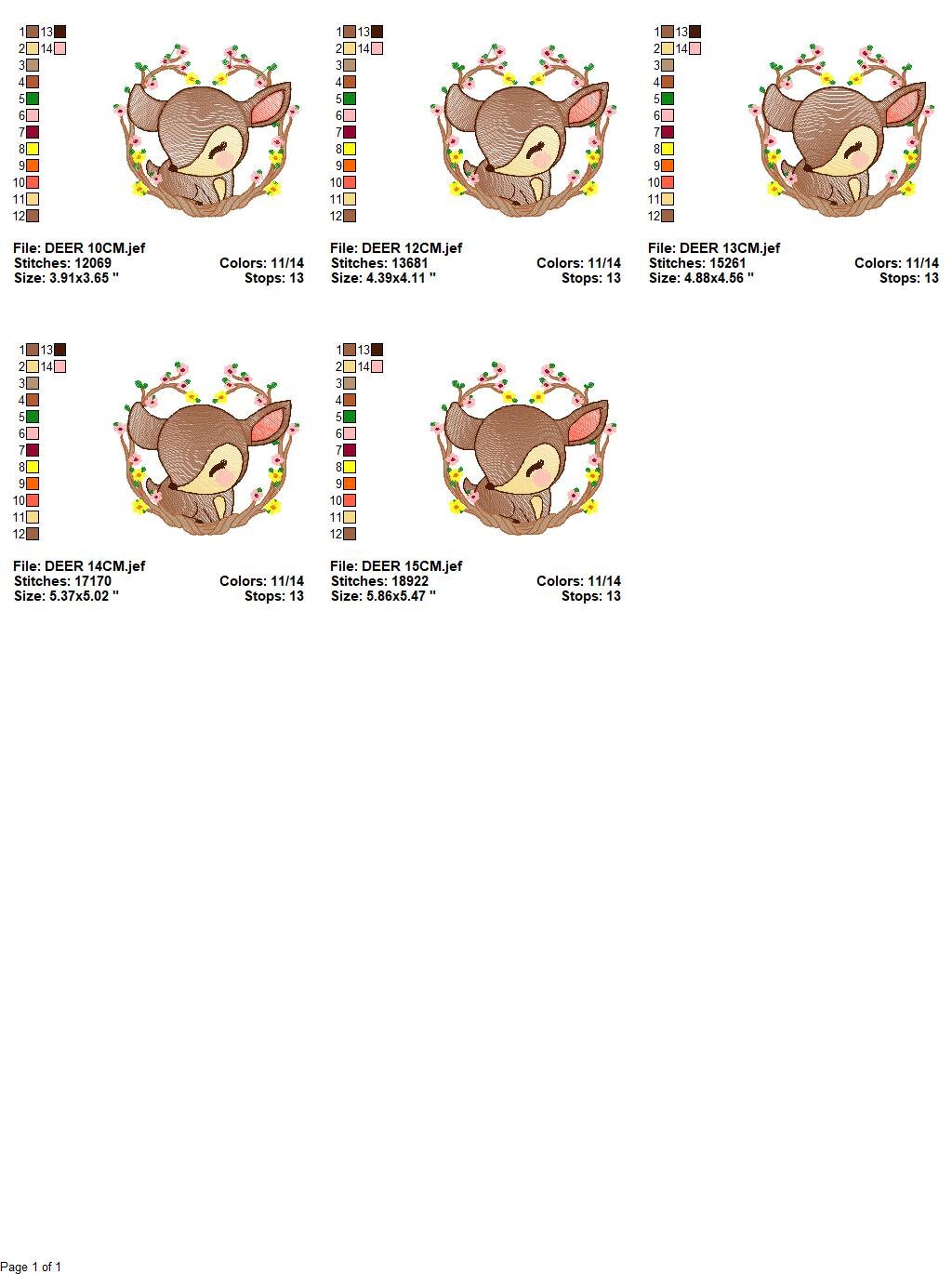 There are 5 sizes included, please check the information under the pictures for the precise sizes of each design, stitch count, color changes and etc.