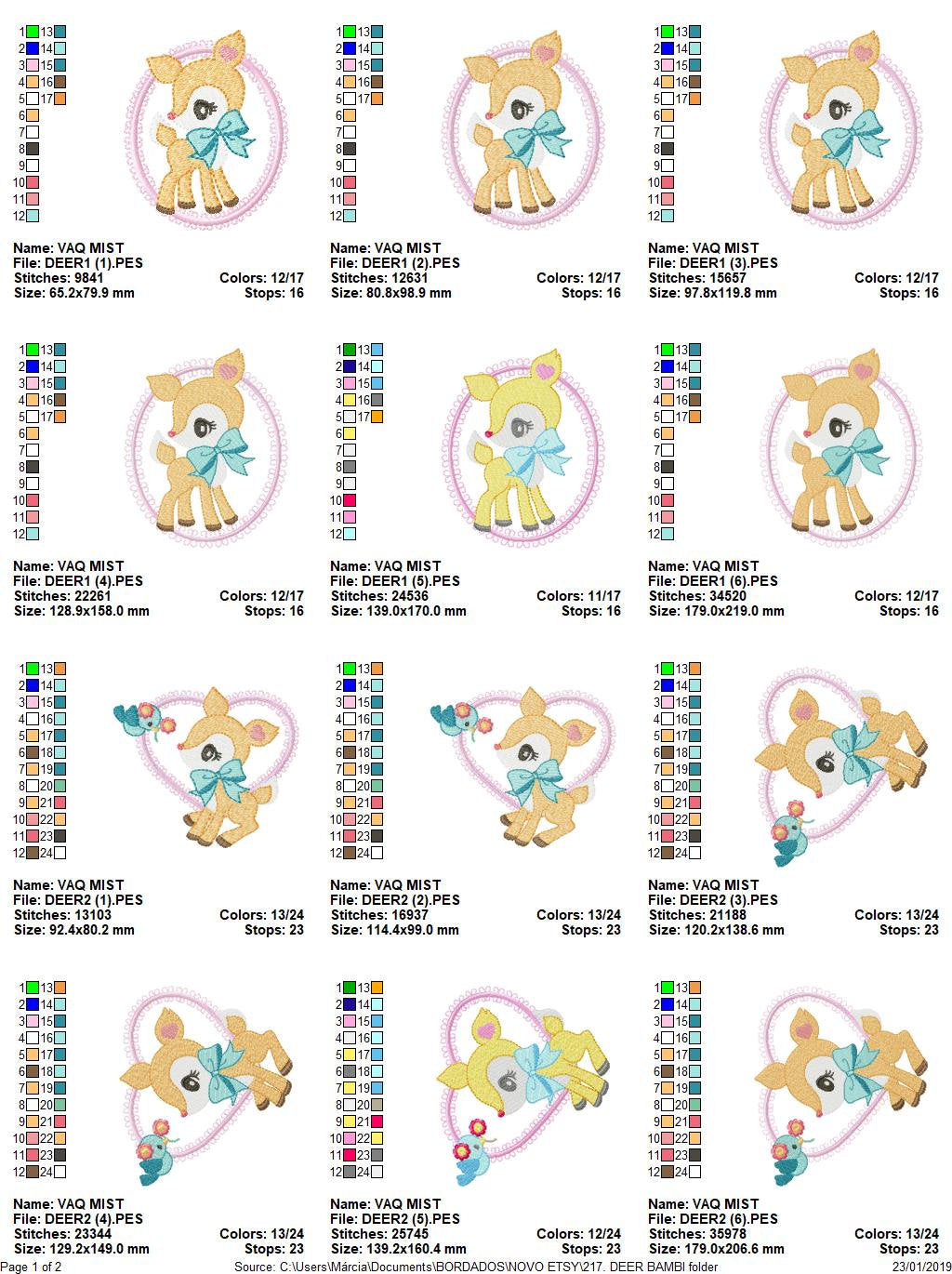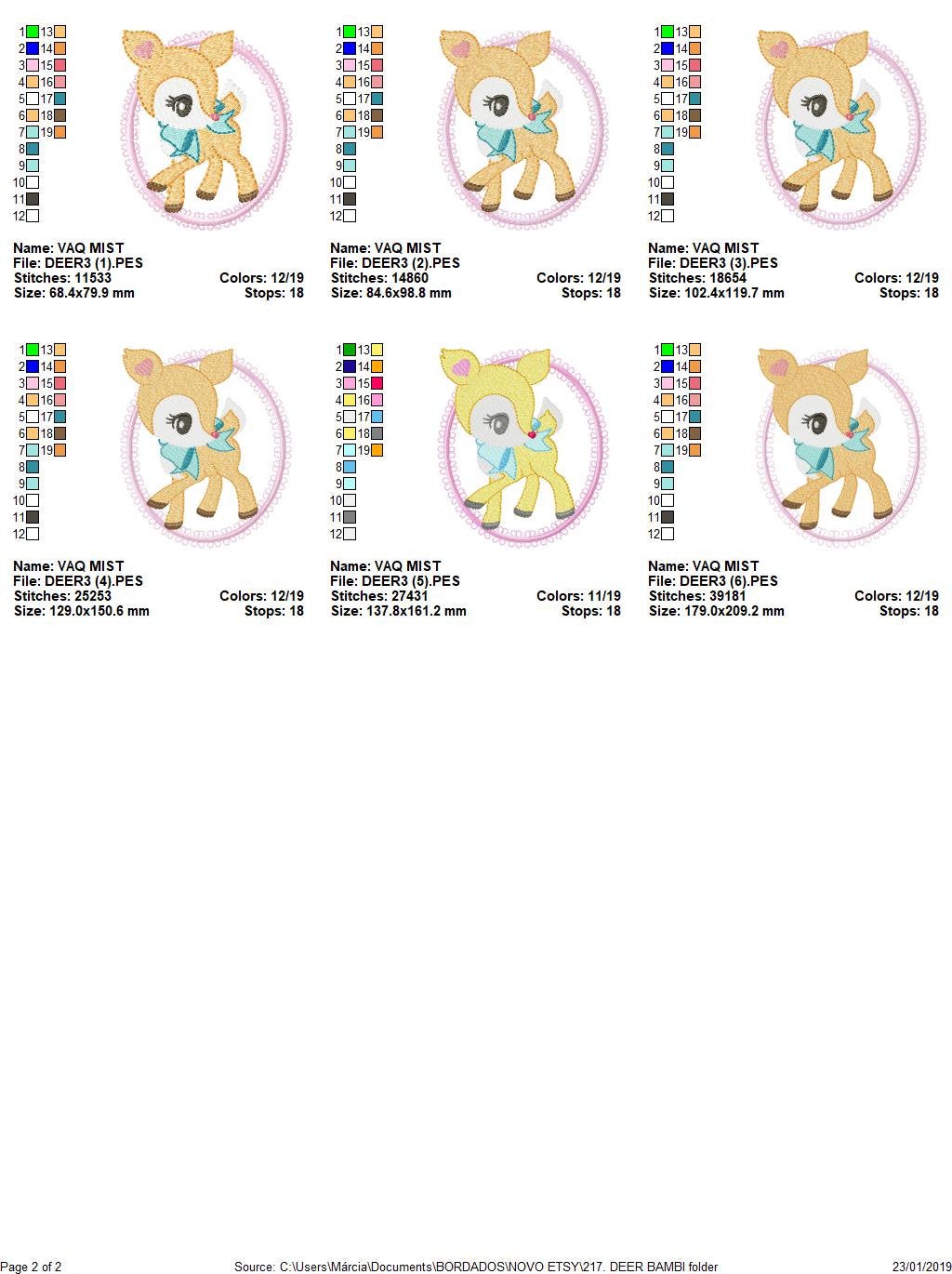 There are 6 sizes included for each design, please check the information under the pictures for the precise sizes of each design, stitch count, color changes and etc.