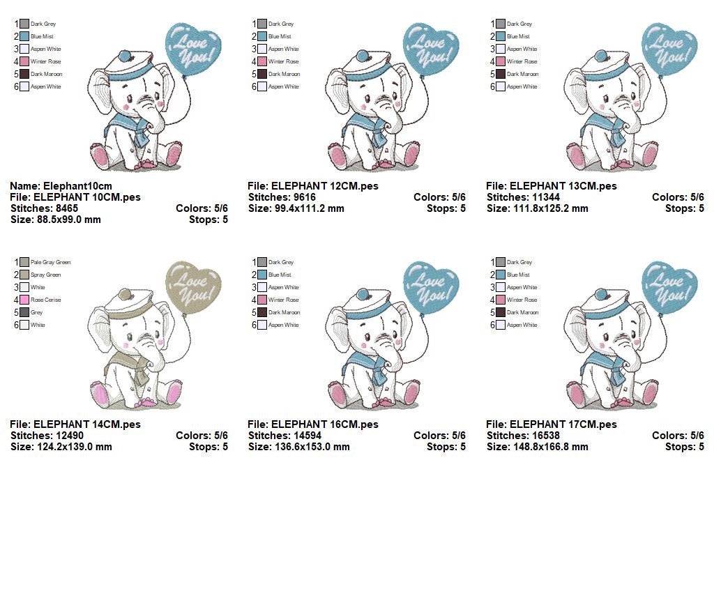 There are 6 sizes included for each design, please check the information under the pictures for the precise sizes of each design, stitch count, color changes and etc.