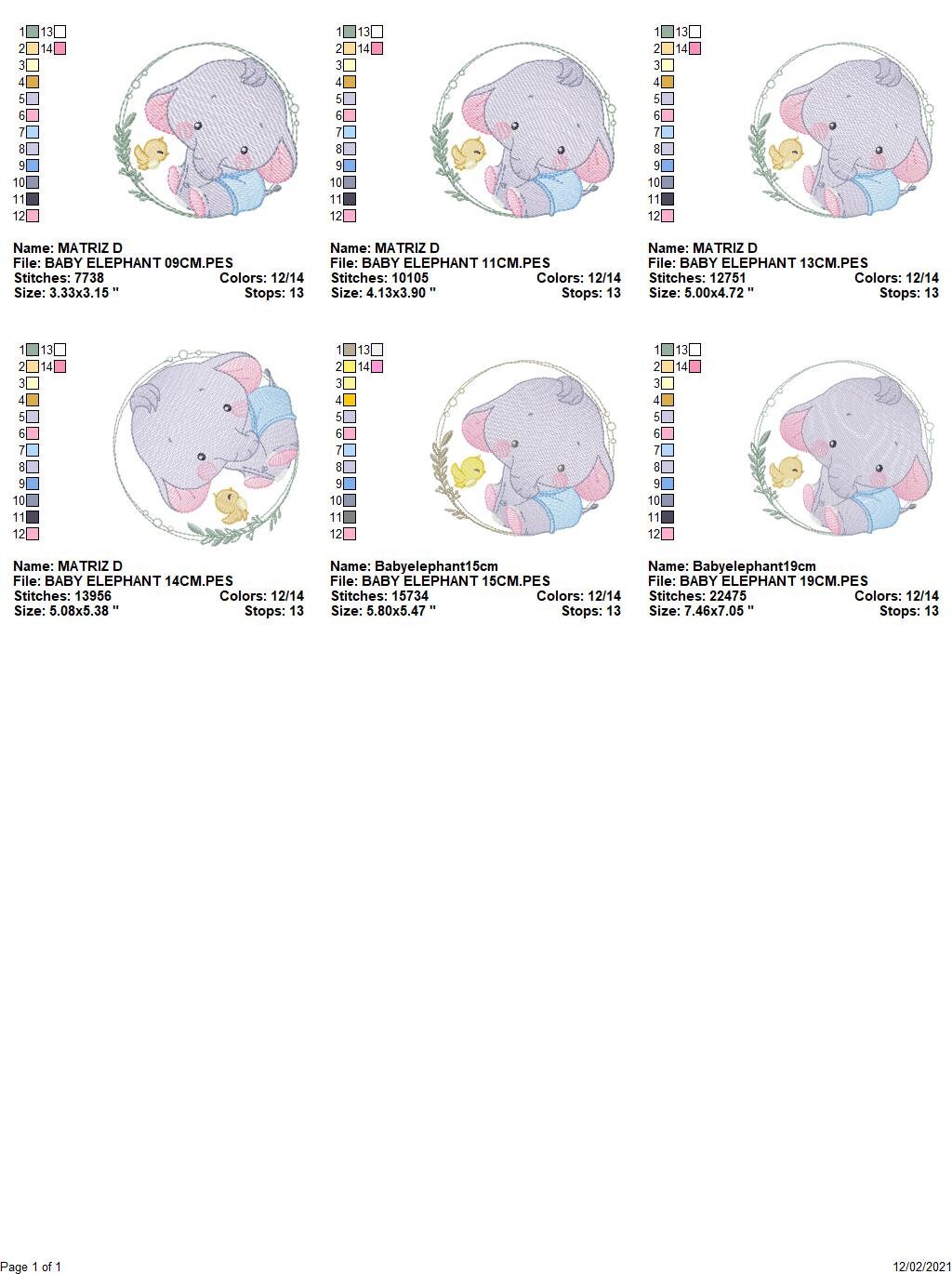 There are 6 sizes included, please check the information under the pictures for the precise sizes of each design, stitch count, color changes and etc.