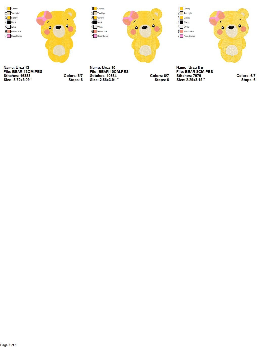 There are 3 sizes included, please check the information under the pictures for the precise sizes of each design, stitch count, color changes and etc.