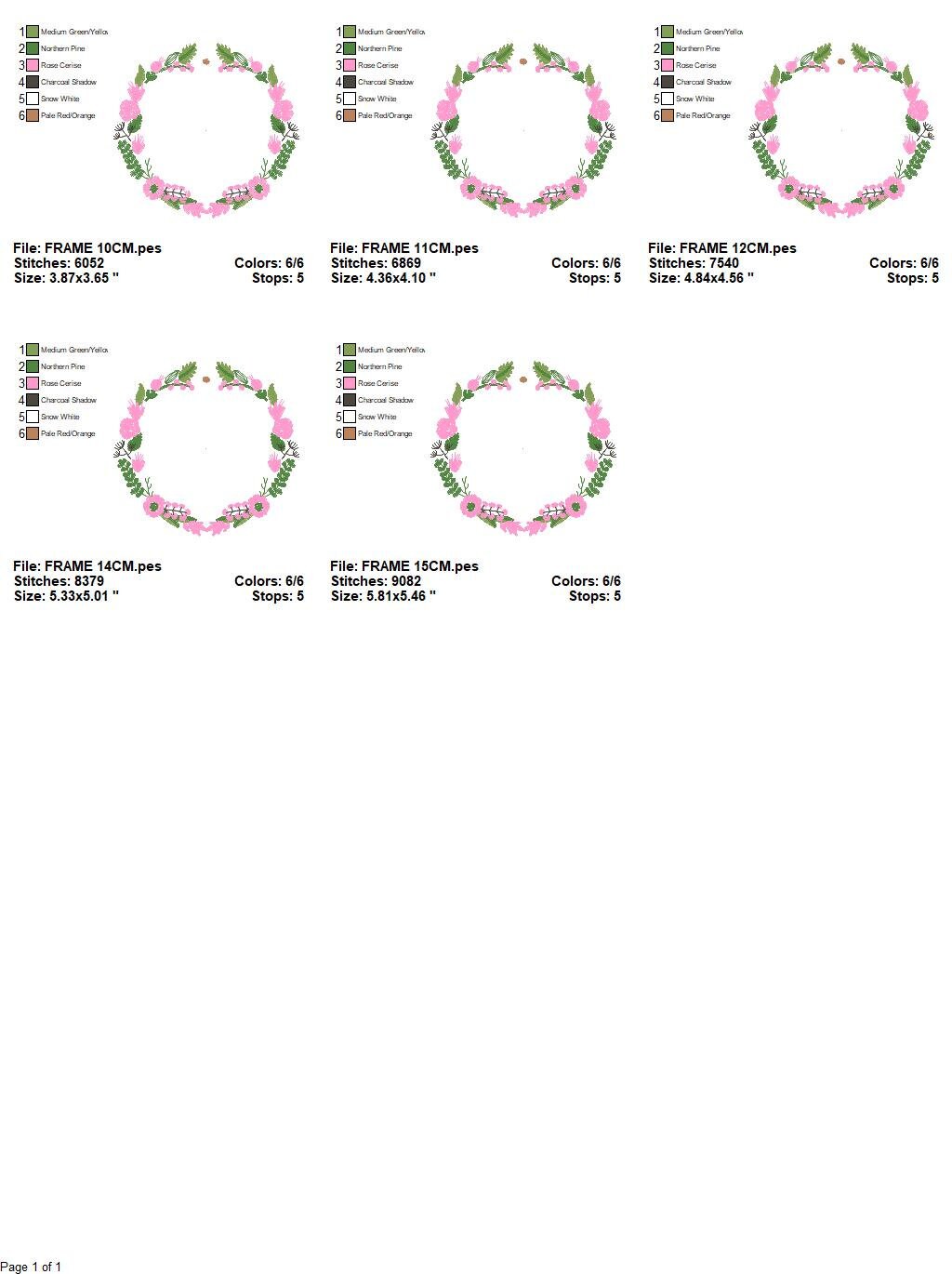 There are 5 sizes included, please check the information under the pictures for the precise sizes of each design, stitch count, color changes and etc.
