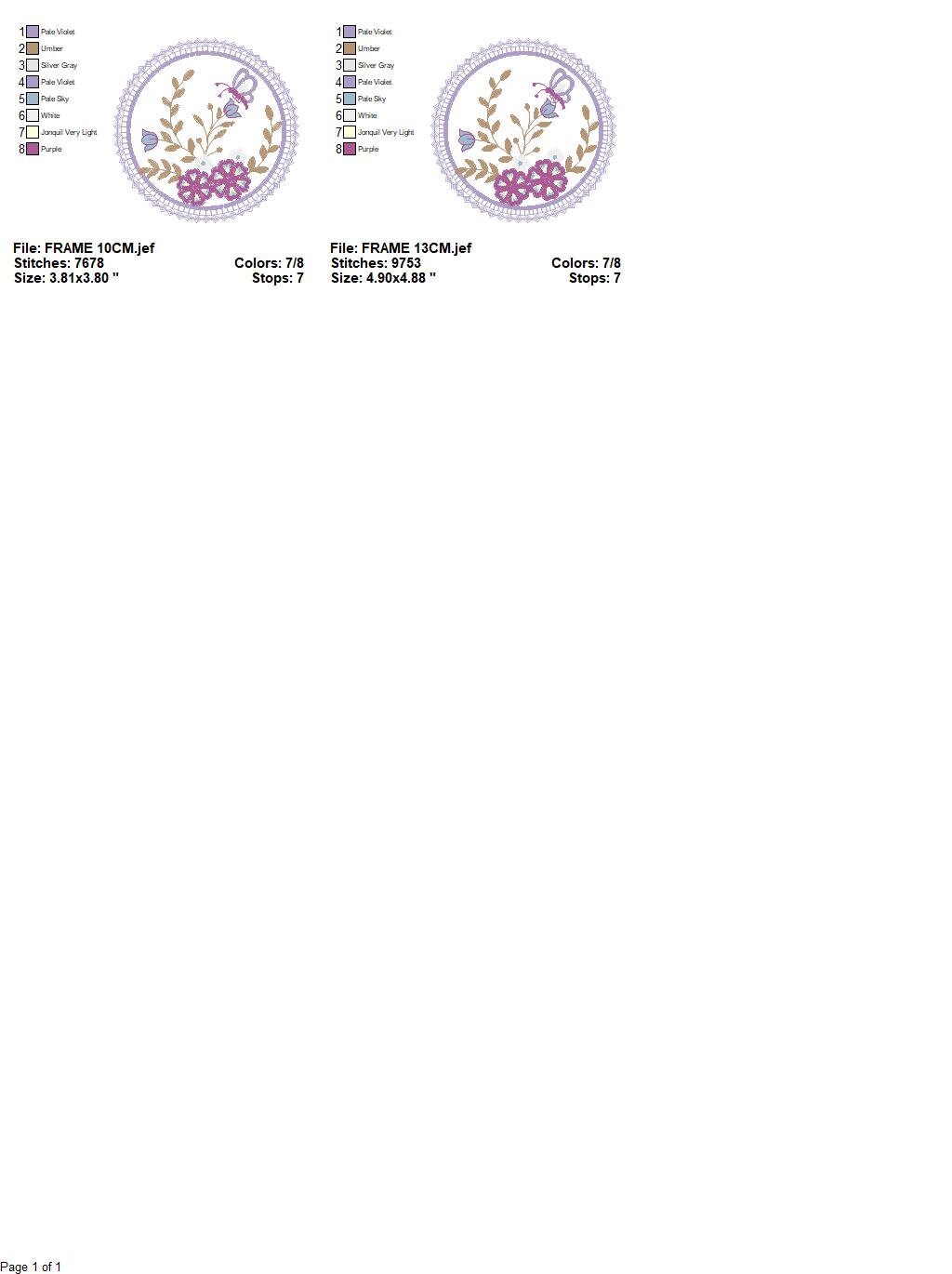 There are 2 sizes included for each design, please check the information under the pictures for the precise sizes of each design, stitch count, color changes and etc.