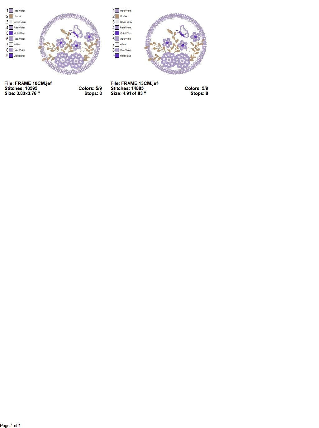 There are 2 sizes included for each design, please check the information under the pictures for the precise sizes of each design, stitch count, color changes and etc.