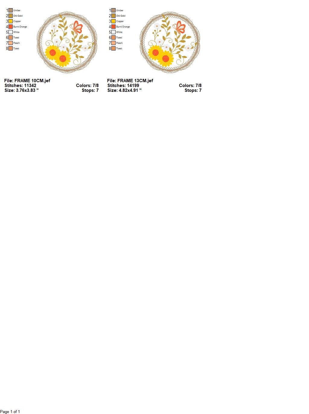 There are 2 sizes included for each design, please check the information under the pictures for the precise sizes of each design, stitch count, color changes and etc.