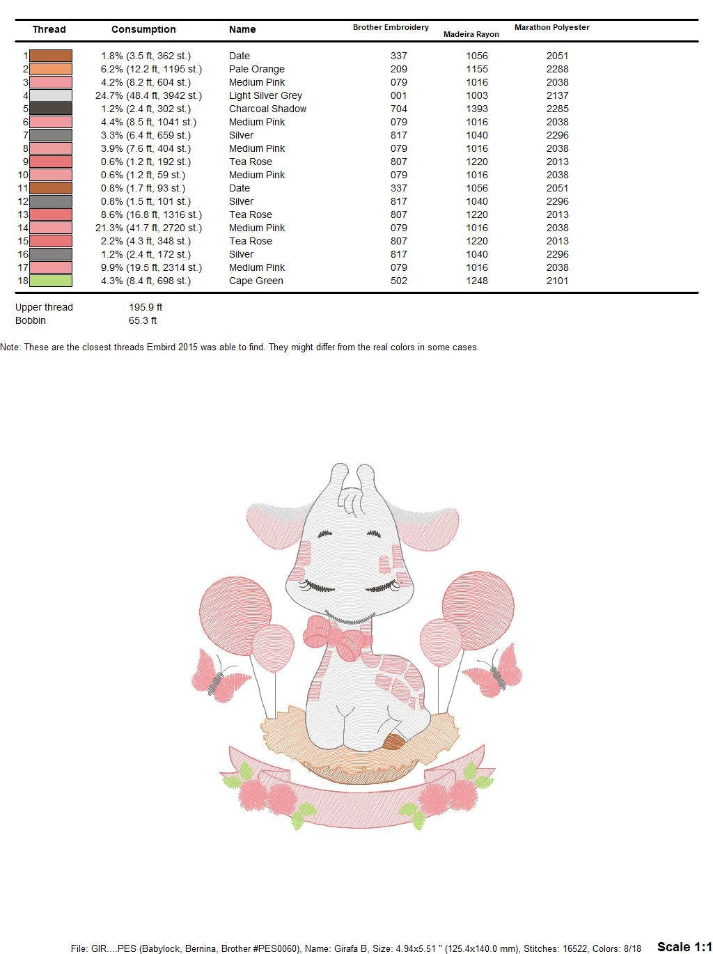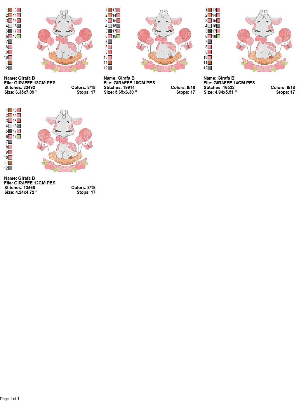 There are 4 sizes included, please check the information under the pictures for the precise sizes of each design, stitch count, color changes and etc.