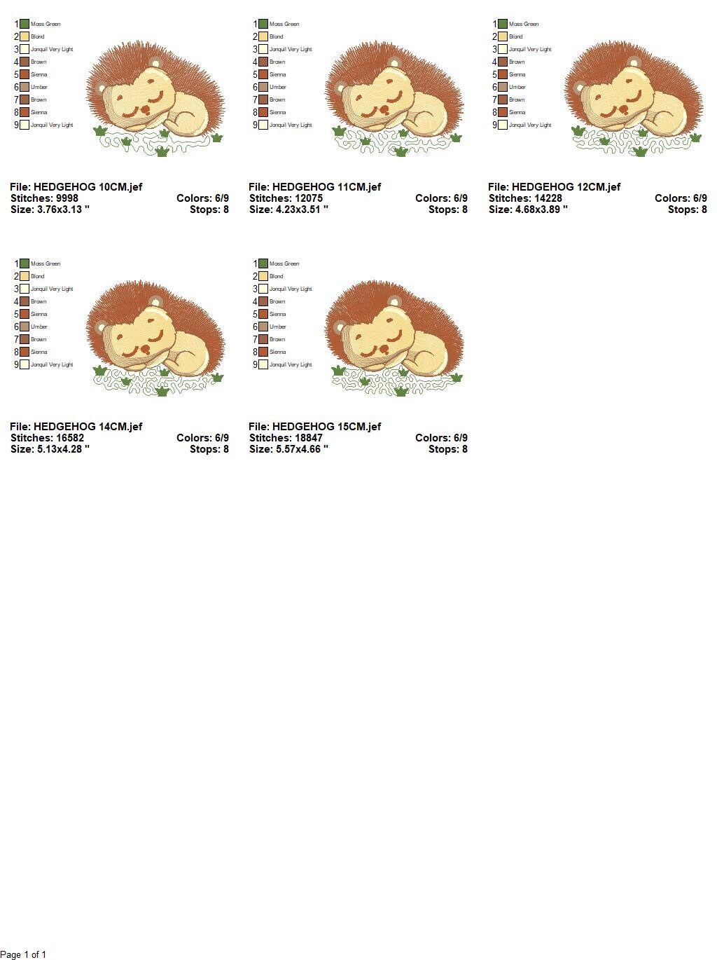 There are 5 sizes included for each design, please check the information under the pictures for the precise sizes of each design, stitch count, color changes and etc.