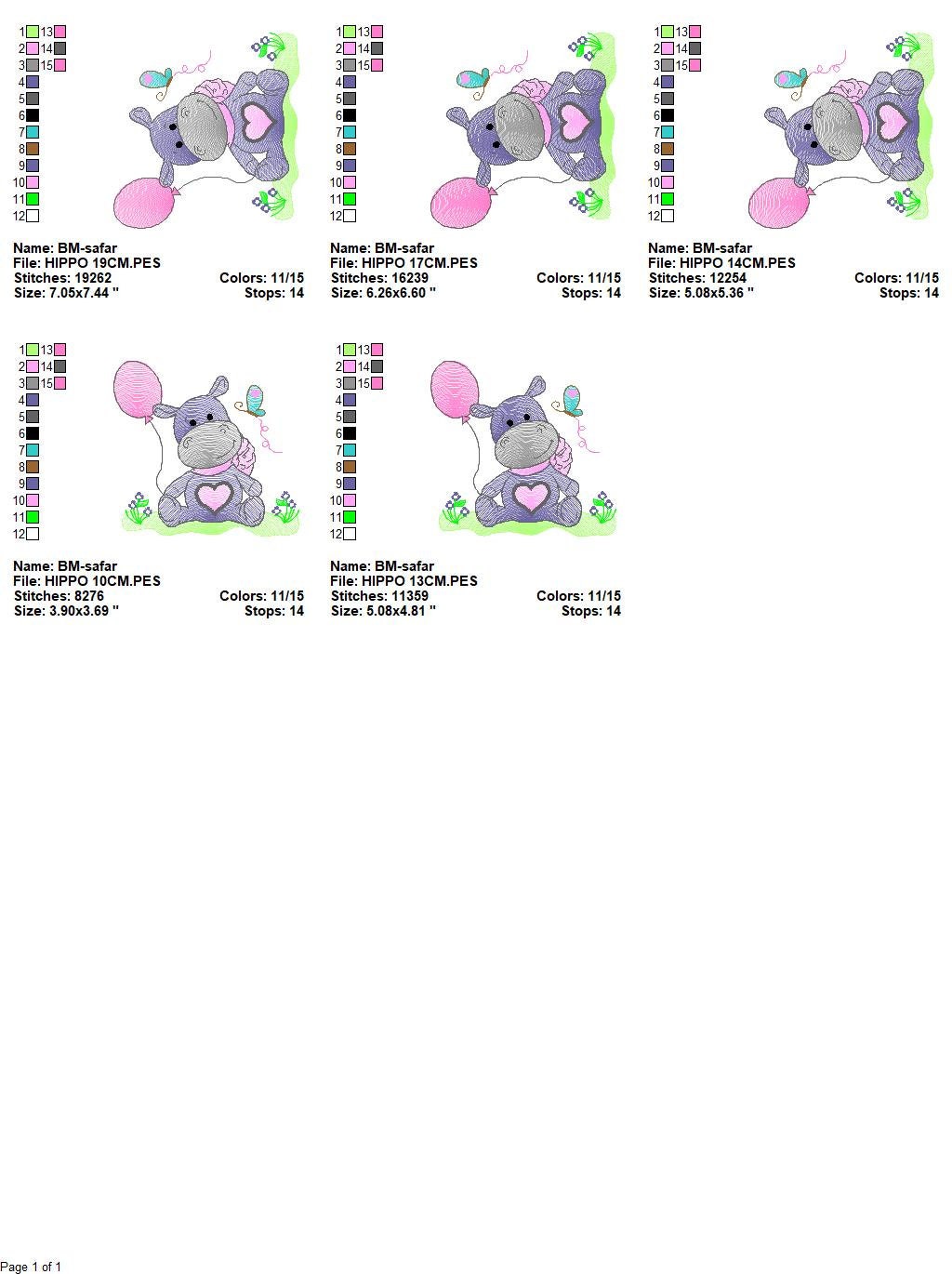 There are 5 sizes included, please check the information under the pictures for the precise sizes of each design, stitch count, color changes and etc.