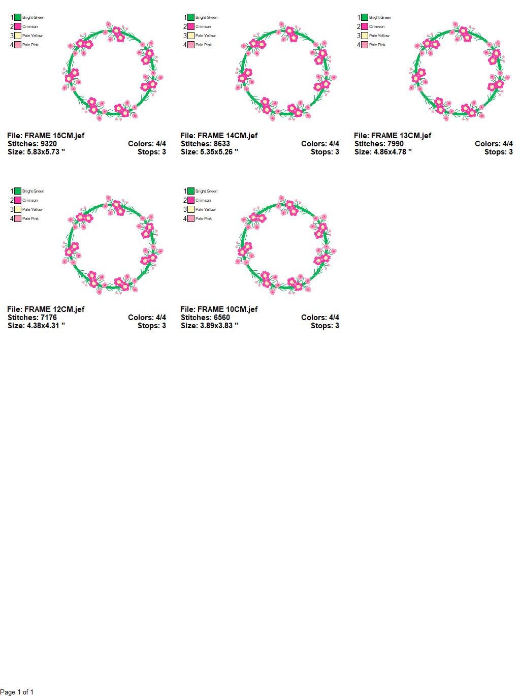 There are 5 sizes included, please check the information under the pictures for the precise sizes of each design, stitch count, color changes and etc.