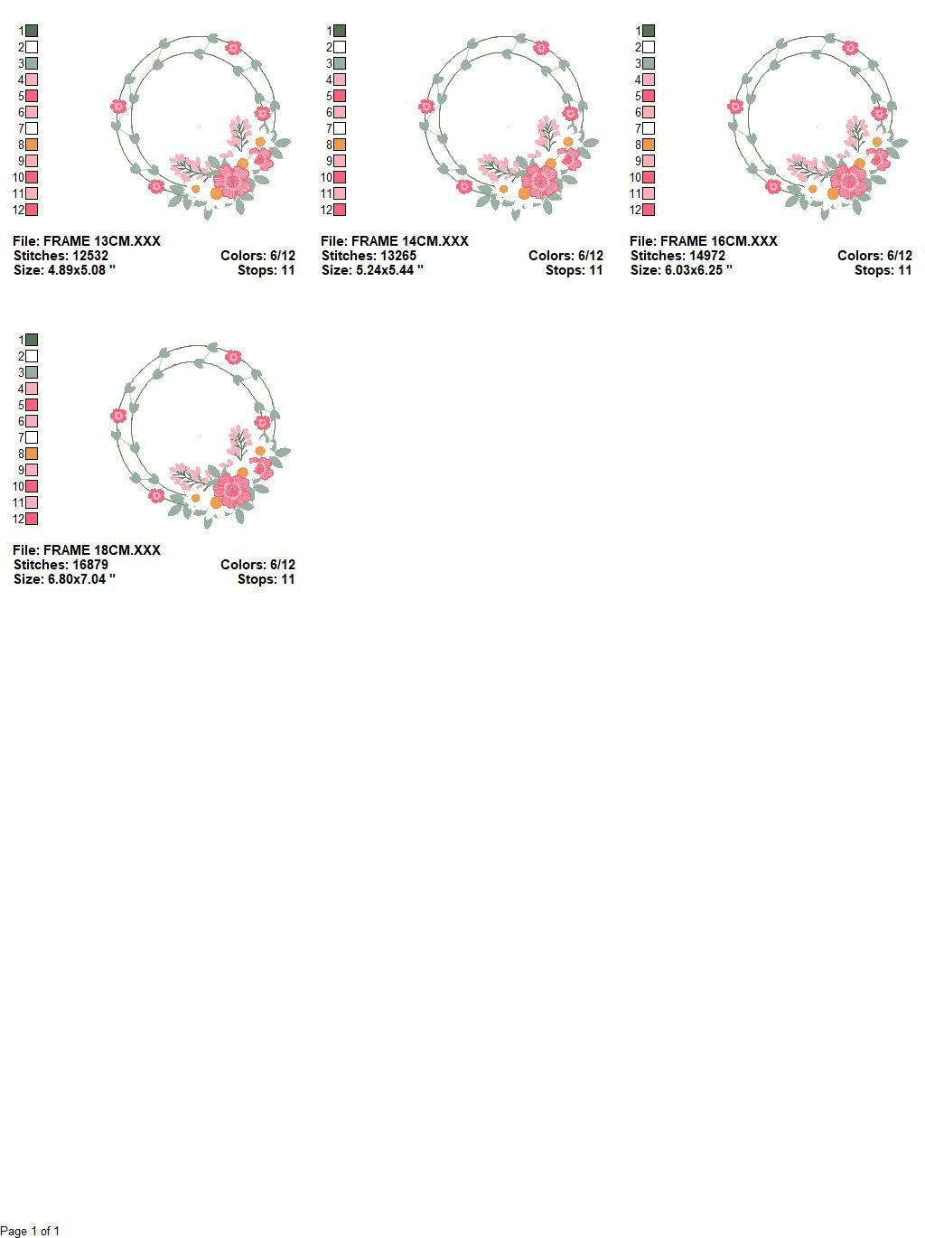 There are 4 sizes included, please check the information under the pictures for the precise sizes of each design, stitch count, color changes and etc.
