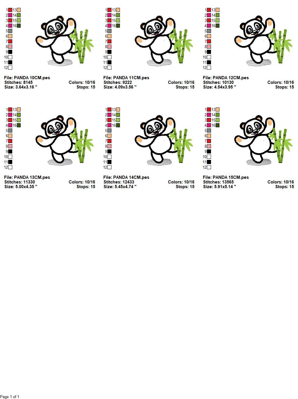 There are 6 sizes included, please check the information under the pictures for the precise sizes of each design, stitch count, color changes and etc.