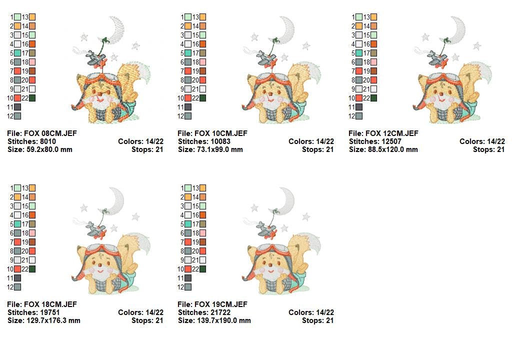 There are 5 sizes included, please check the information under the pictures for the precise sizes of each design, stitch count, color changes and etc.