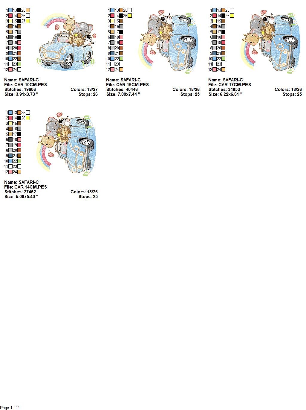 There are 4 sizes included for each design, please check the information under the pictures for the precise sizes of each design, stitch count, color changes and etc.