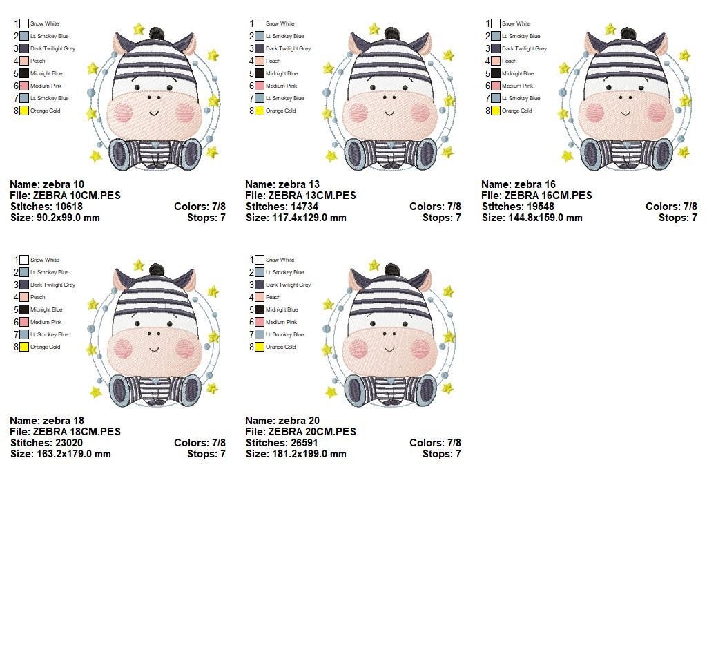 There are 5 sizes included, please check the information under the pictures for the precise sizes of each design, stitch count, color changes and etc.