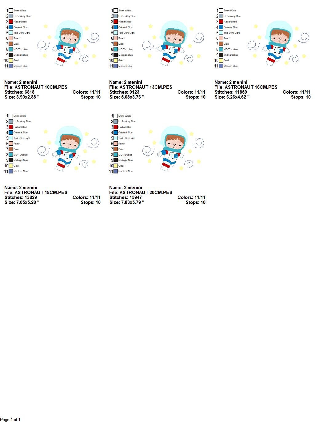 There are 5 sizes included, please check the information under the pictures for the precise sizes of each design, stitch count, color changes and etc.