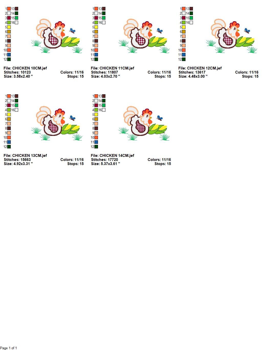 There are 5 sizes included, please check the information under the pictures for the precise sizes of each design, stitch count, color changes and etc.