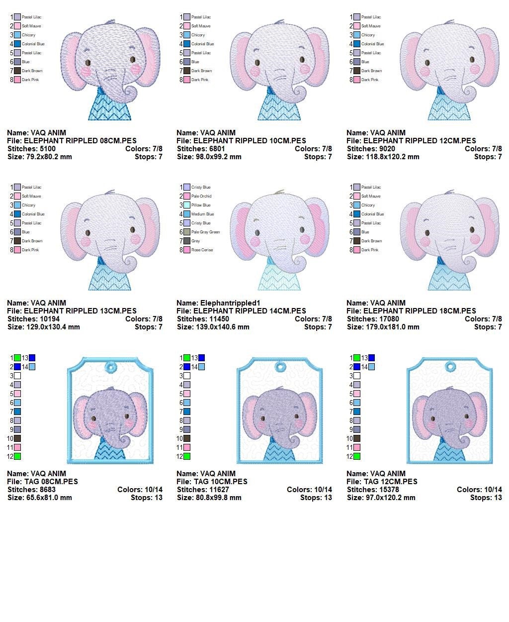 There are 6 sizes included for each design, please check the information under the pictures for the precise sizes of each design, stitch count, color changes and etc: