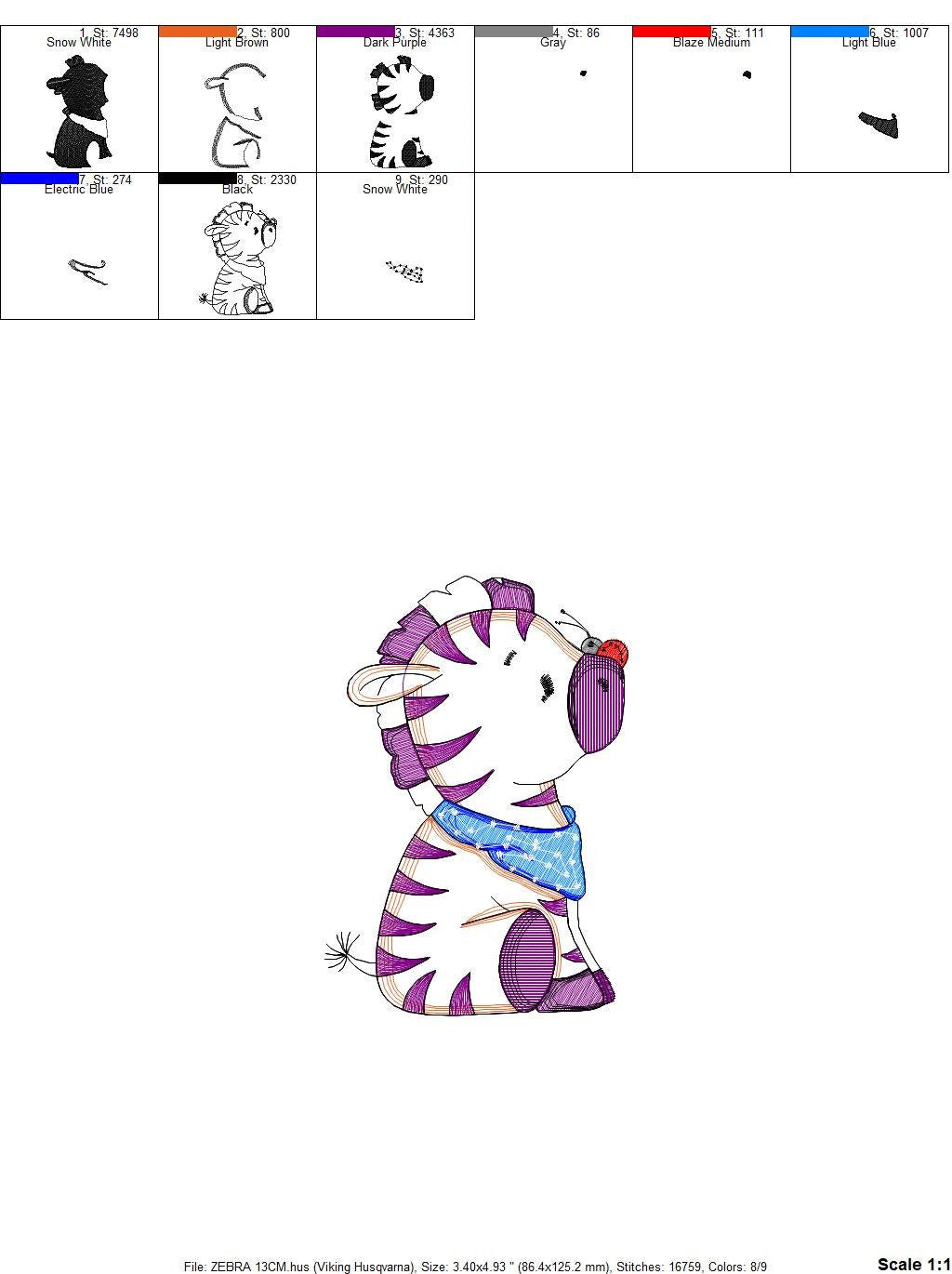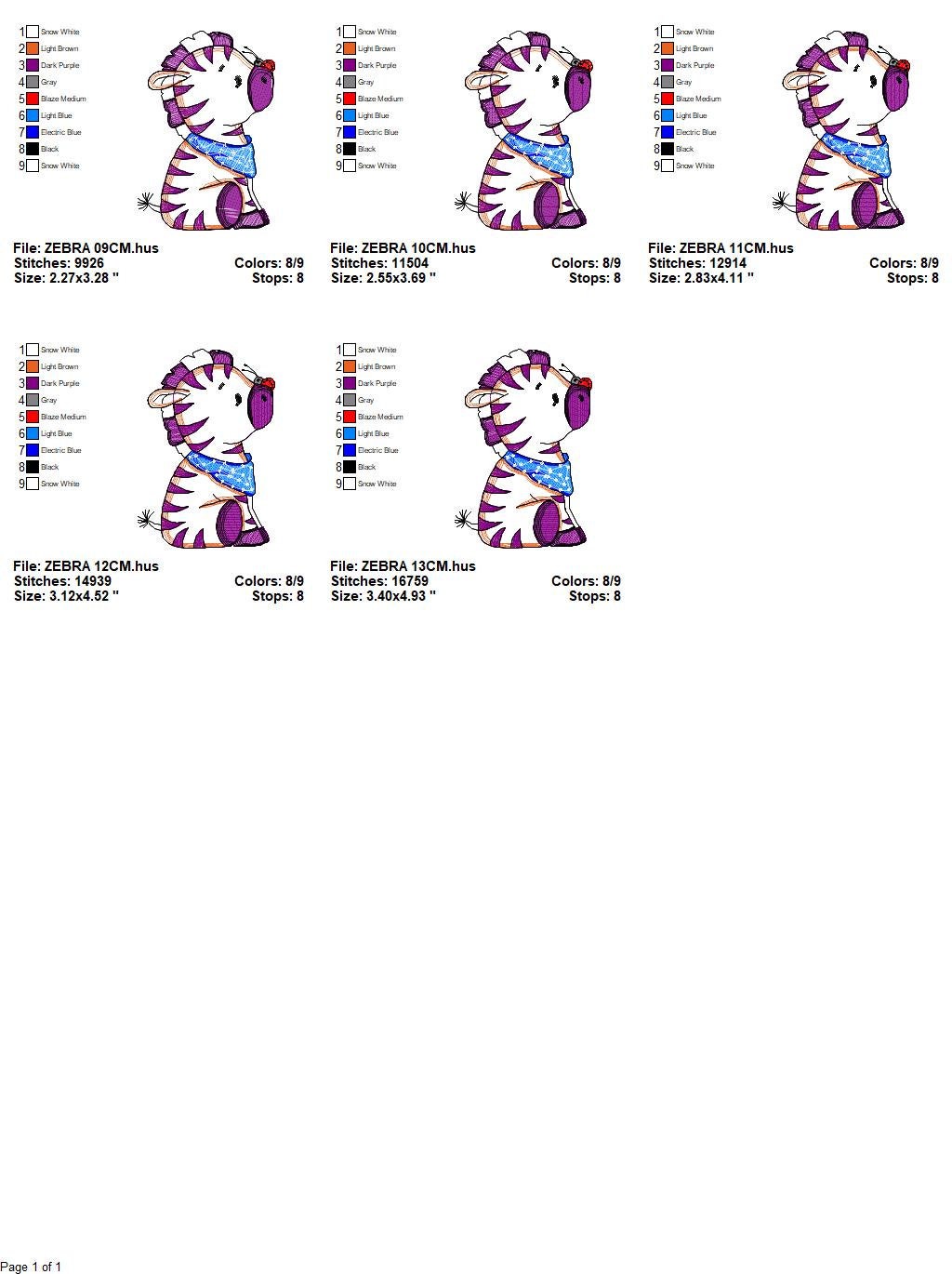There are 5 sizes included, please check the information under the pictures for the precise sizes of each design, stitch count, color changes and etc.