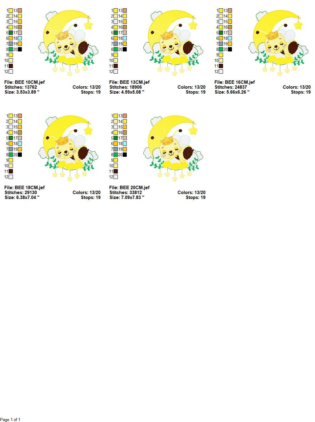 There are 5 sizes included for each design, please check the information under the pictures for the precise sizes of each design, stitch count, color changes and etc.