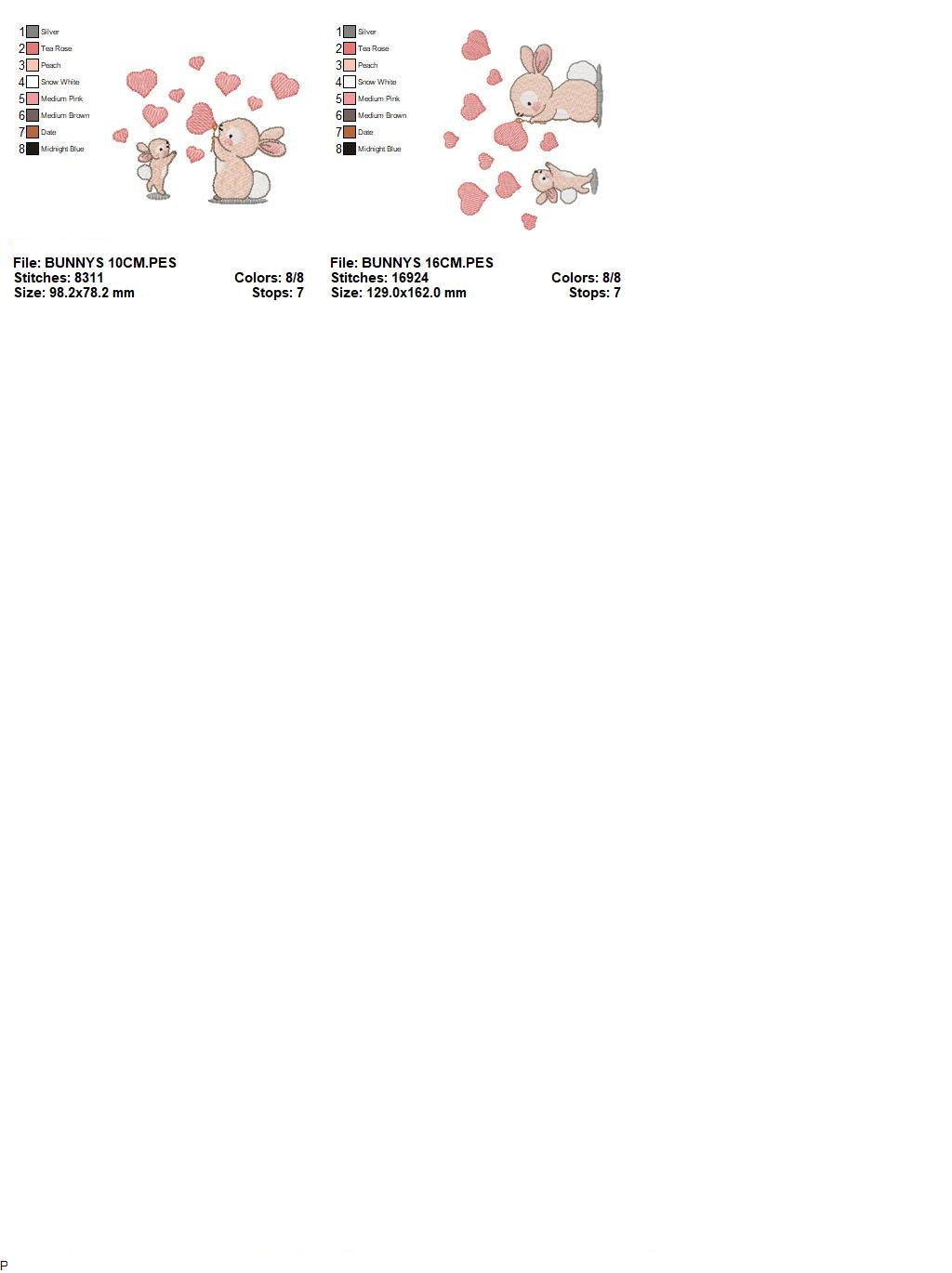 There are 2 sizes included for each design, please check the information under the pictures for the precise sizes of each design, stitch count, color changes and etc.