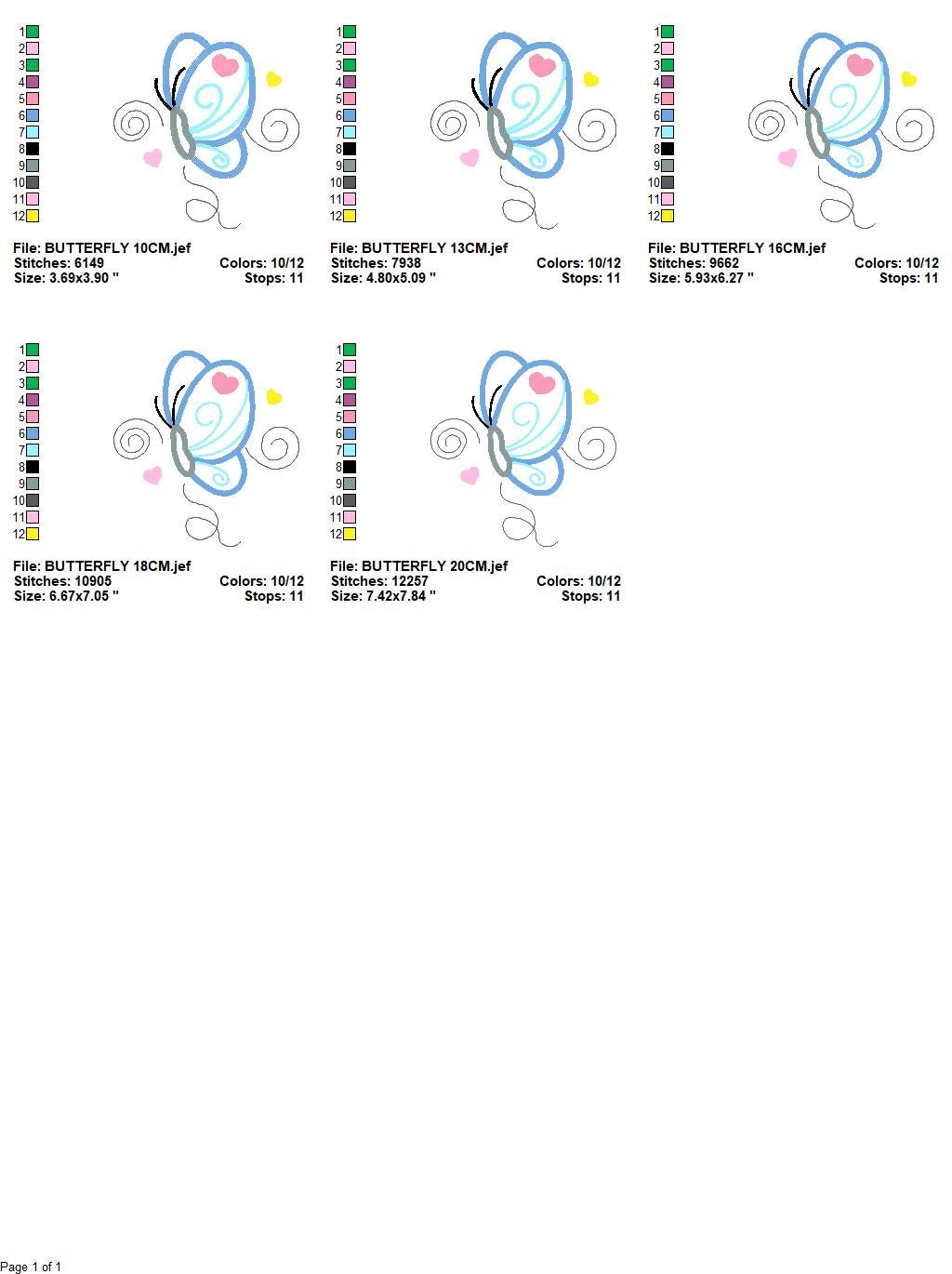 There are 5 sizes included for each design, please check the information under the pictures for the precise sizes of each design, stitch count, color changes and etc.