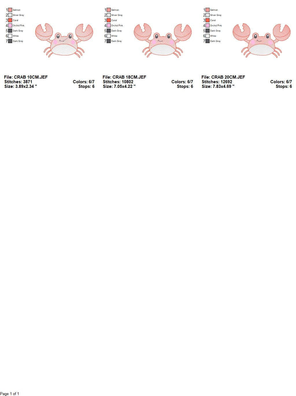 There are 3 sizes included for each design, please check the information under the pictures for the precise sizes of each design, stitch count, color changes and etc.