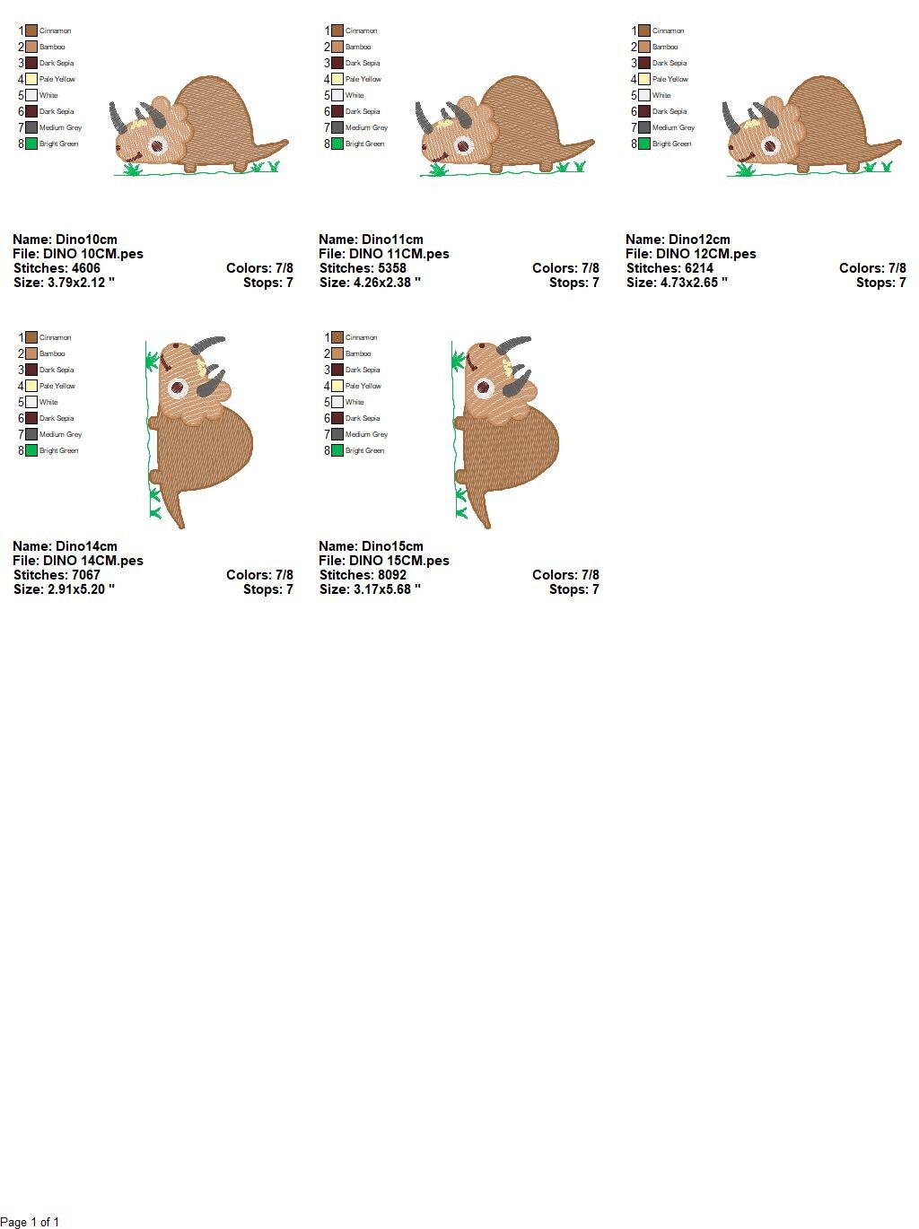 There are 5 sizes included, please check the information under the pictures for the precise sizes of each design, stitch count, color changes and etc.