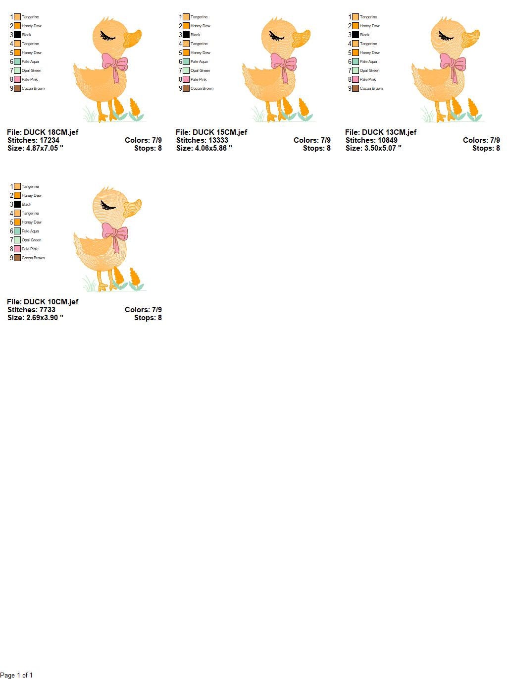 There are 4 sizes included, please check the information under the pictures for the precise sizes of each design, stitch count, color changes and etc.