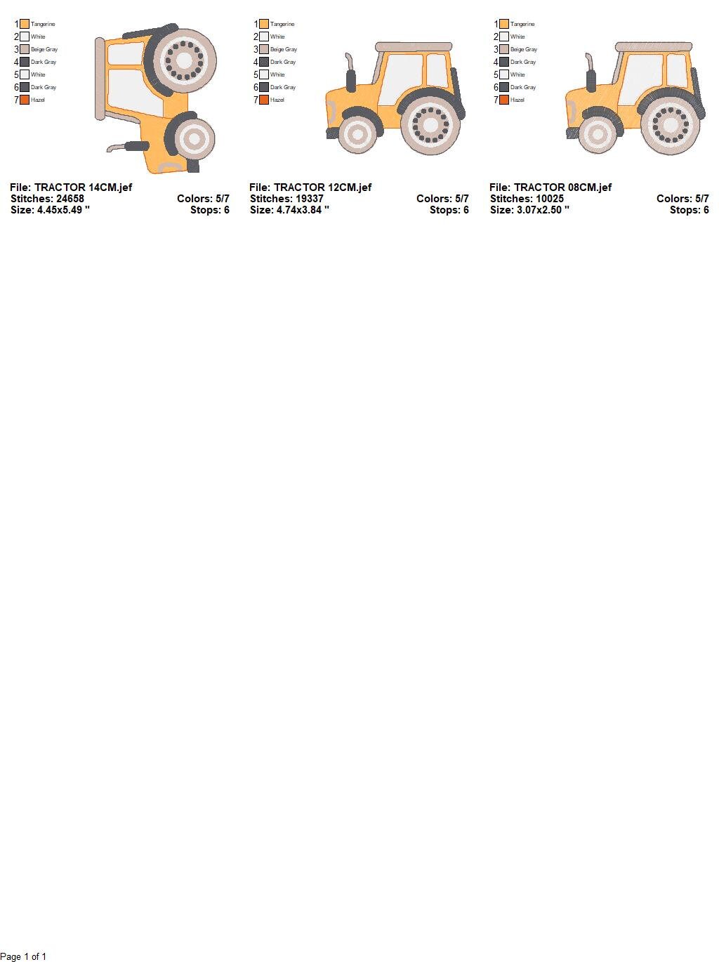 There are 3 sizes included, please check the information under the pictures for the precise sizes of each design, stitch count, color changes, etc.