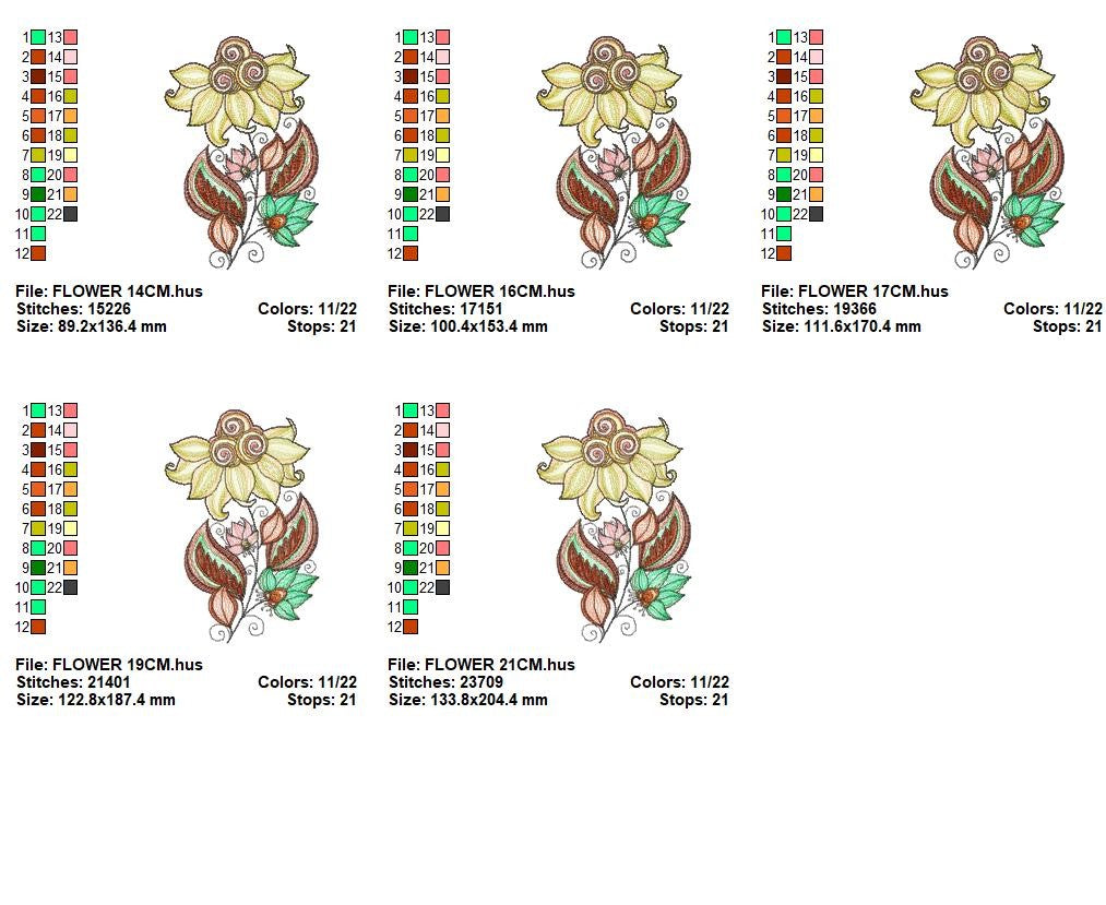 There are 5 sizes included, please check the information under the pictures for the precise sizes of each design, stitch count, color changes and etc.