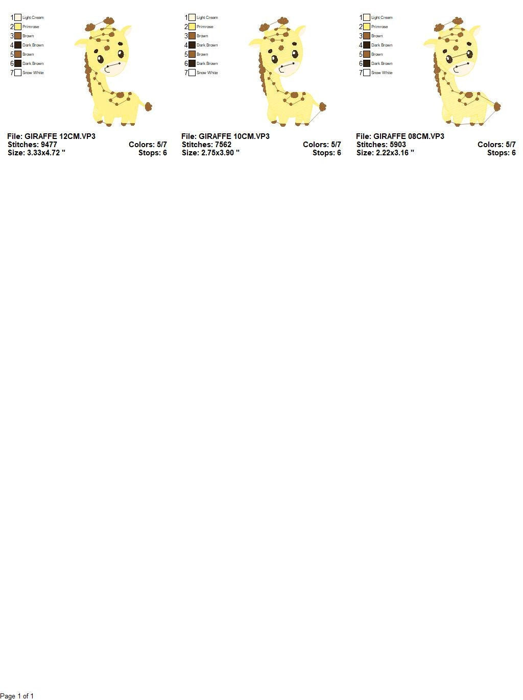 There are 3 sizes included, please check the information under the pictures for the precise sizes of each design, stitch count, color changes and etc.