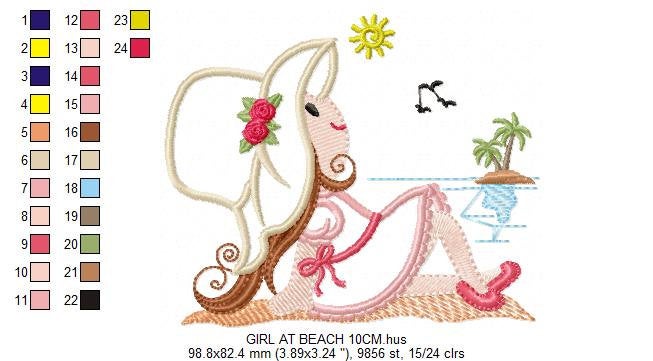 This is a digital download machine embroidery design of GIRL AT THE BEACH, applique design, instant download.