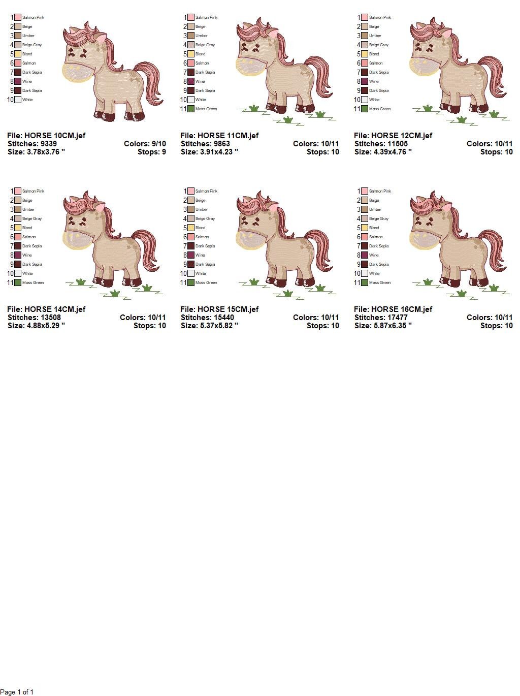 There are 6 sizes included for each design, please check the information under the pictures for the precise sizes of each design, stitch count, color changes and etc.