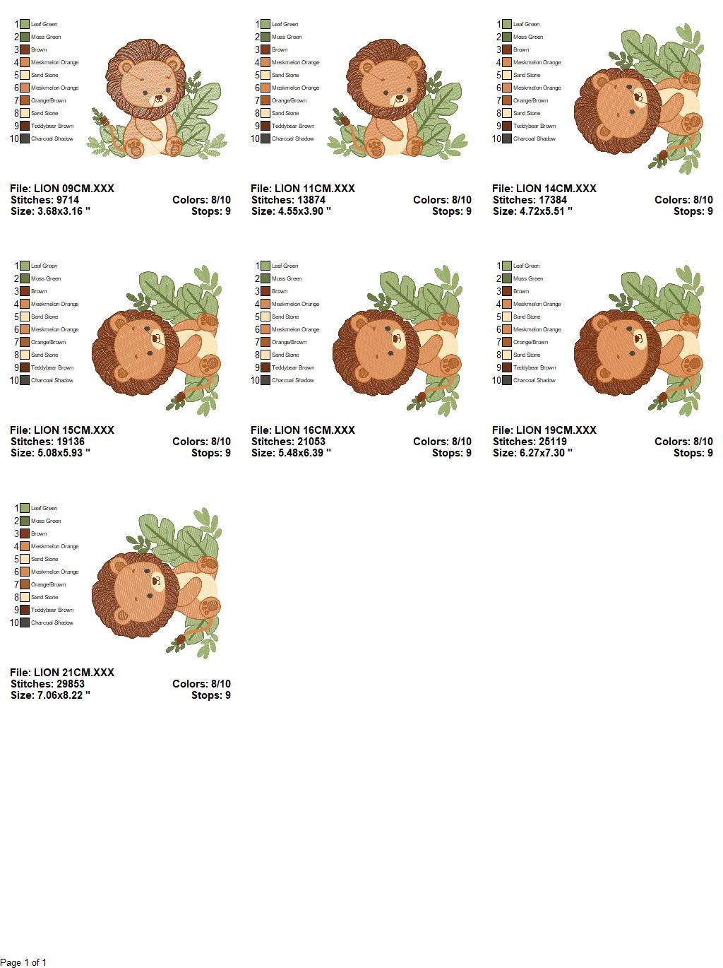 There are 7 sizes included for each design, please check the information under the pictures for the precise sizes of each design, stitch count, color changes etc: