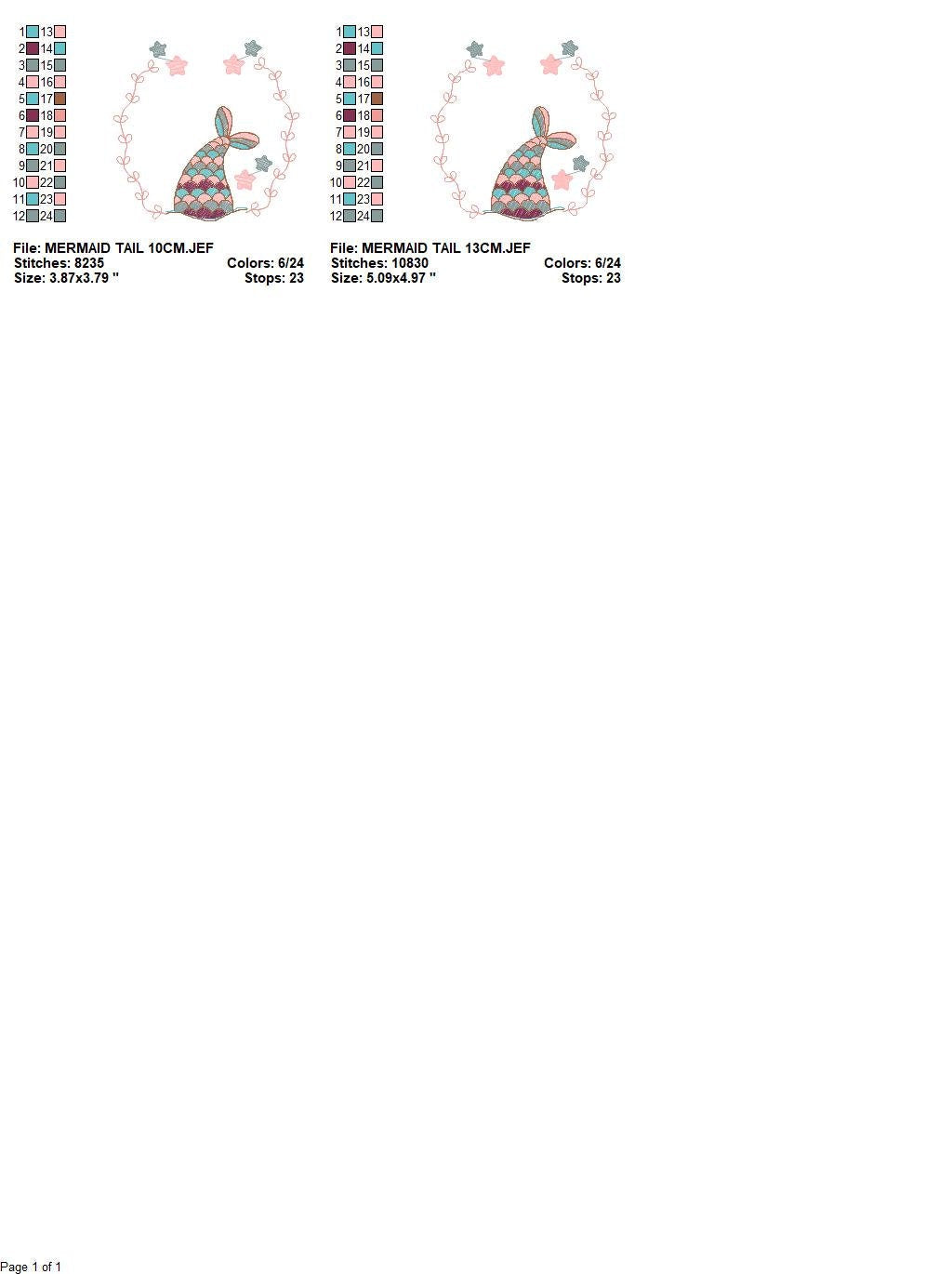There are 2 sizes included, please check the information under the pictures for the precise sizes of each design, stitch count, color changes and etc.
