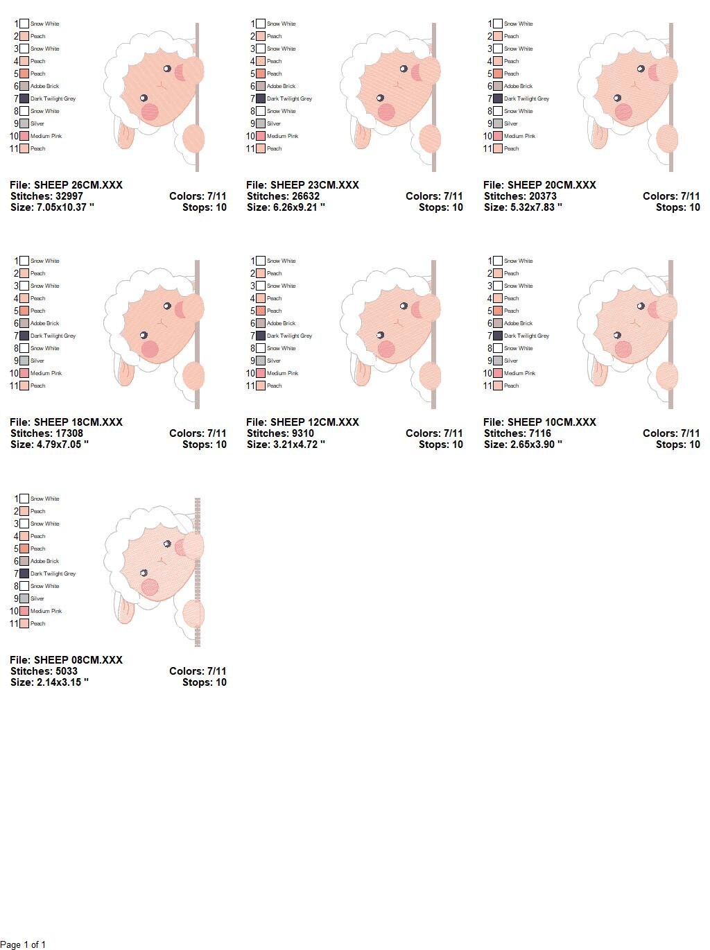 There are 7 sizes included for each design, please check the information under the pictures for the precise sizes of each design, stitch count, color changes and etc.