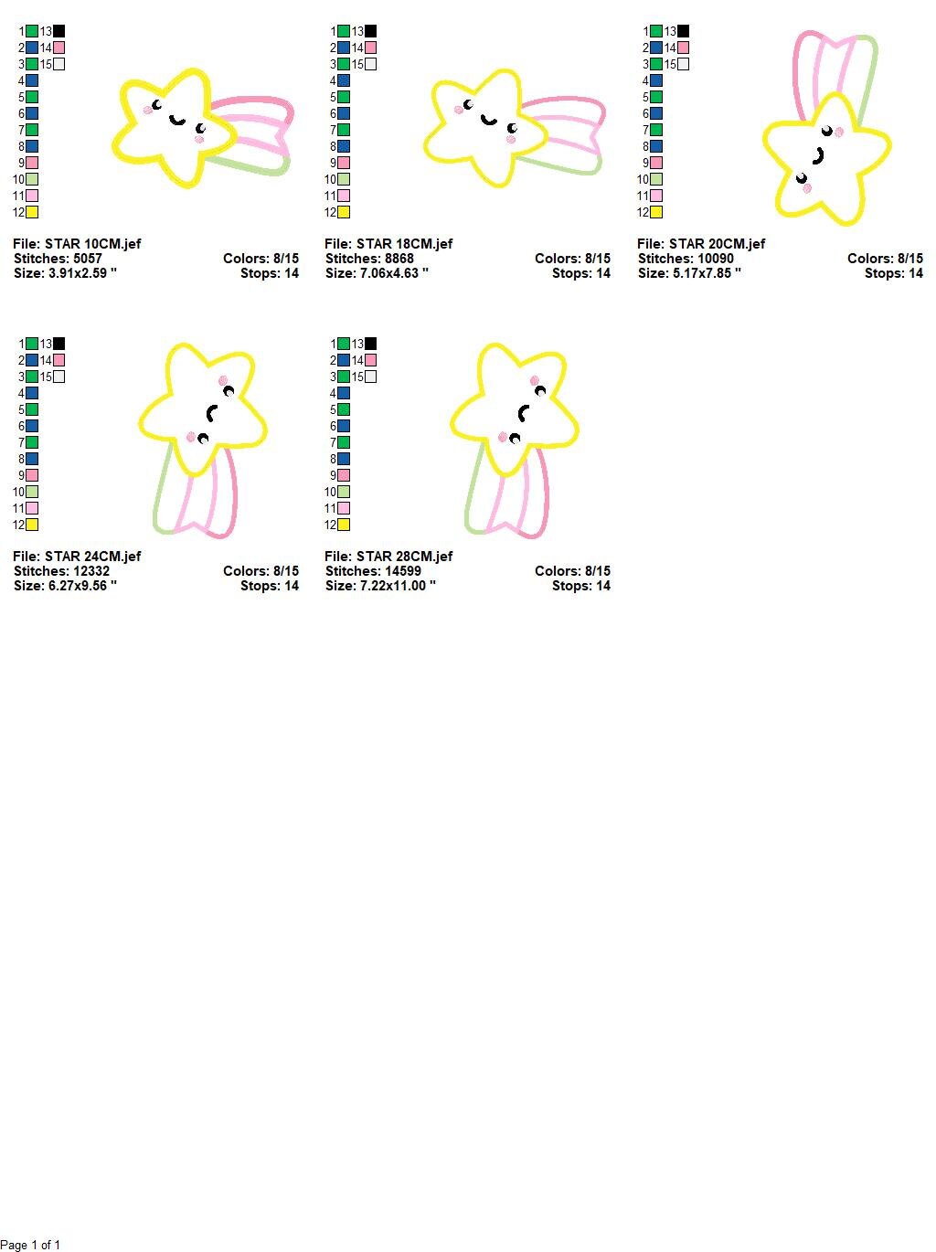 There are 5 sizes included for each design, please check the information under the pictures for the precise sizes of each design, stitch count, color changes and etc.