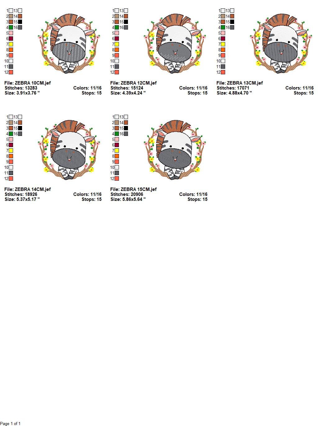 There are 5 sizes included for each design, please check the information under the pictures for the precise sizes of each design, stitch count, color changes and etc.